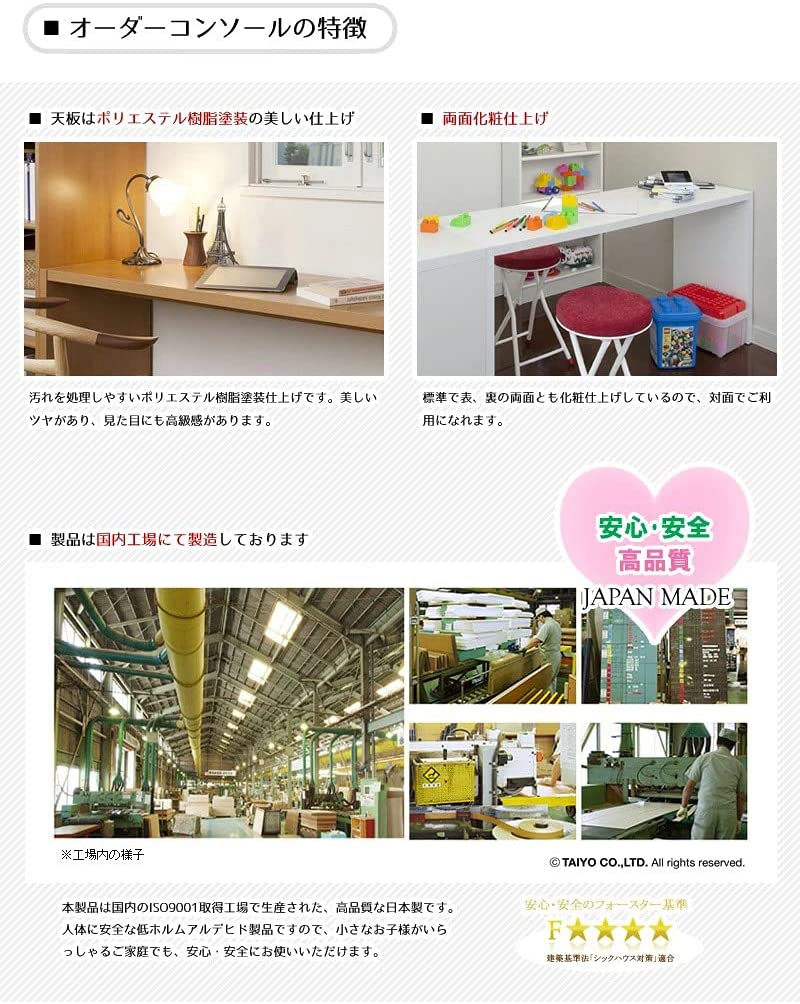 [表面材]天板:合成樹脂化粧繊維板(ポリエステル樹脂)、その他:プリント紙化粧繊維板,[表面加工]天板:ポリエステル樹脂塗装、その他:ウレタン樹脂塗装